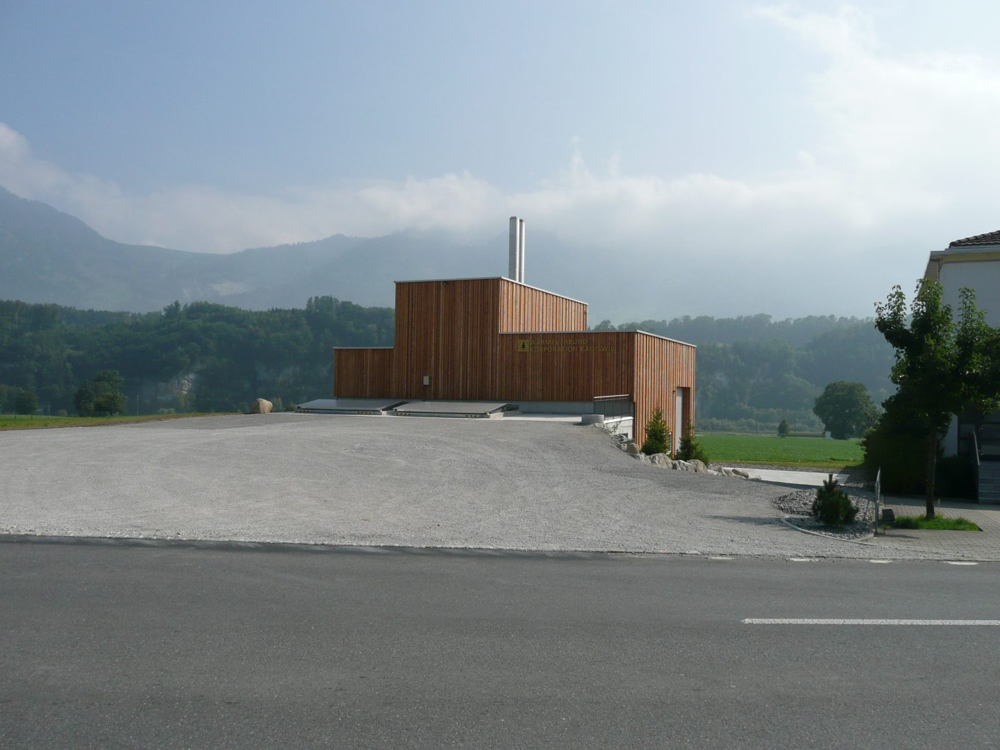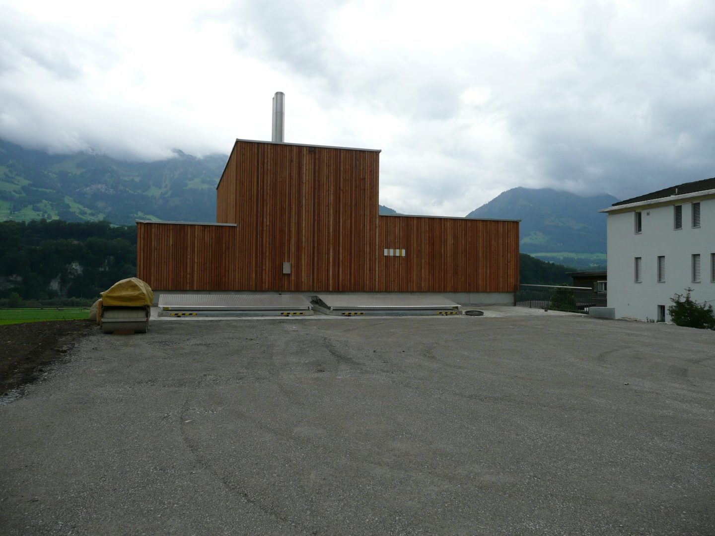 Das Voulmen ist sehr kompakt gehalten, was teilweise wegen der technischen Anforderungen notwendig war, zum anderen das Gebäude als monolithischer Körper eine eigenständige, skulpturale Wirkung zu entfalten vermag. Eine vertikale Holzschalung, welche nur an den Schmalseiten durch Öffnungen durchbrochen wird, erzeugt eine ruhige Wirkung, vergleichbar mit jenen einfachen hölzernen Schuppen, welche der Aufbewahrung von Heu dienen. Die Silos für die Holzschnitzel sind auf der Nordwestseite des Gebäudes angeordnet. Damit werden die erforderlichen Anfahrtswege minimiert. Der Baukörper ist so situiert, dass das gewachsene Terrain nur im Bereich der Anlieferung und des Wendeplatzes geringfügig angepasst werden muss.