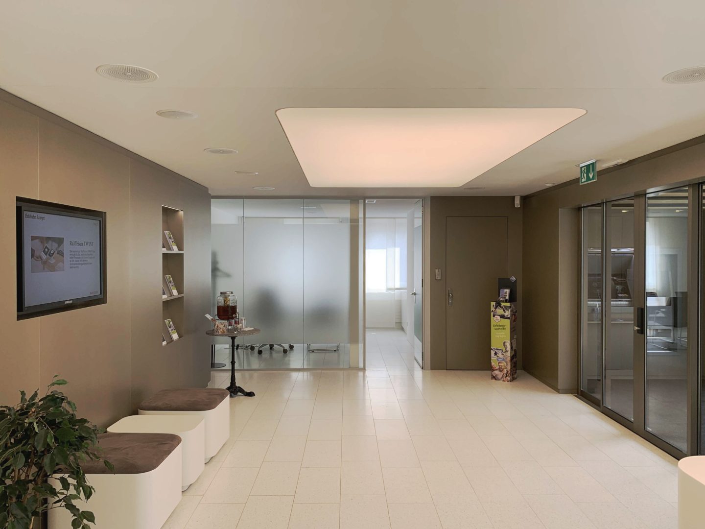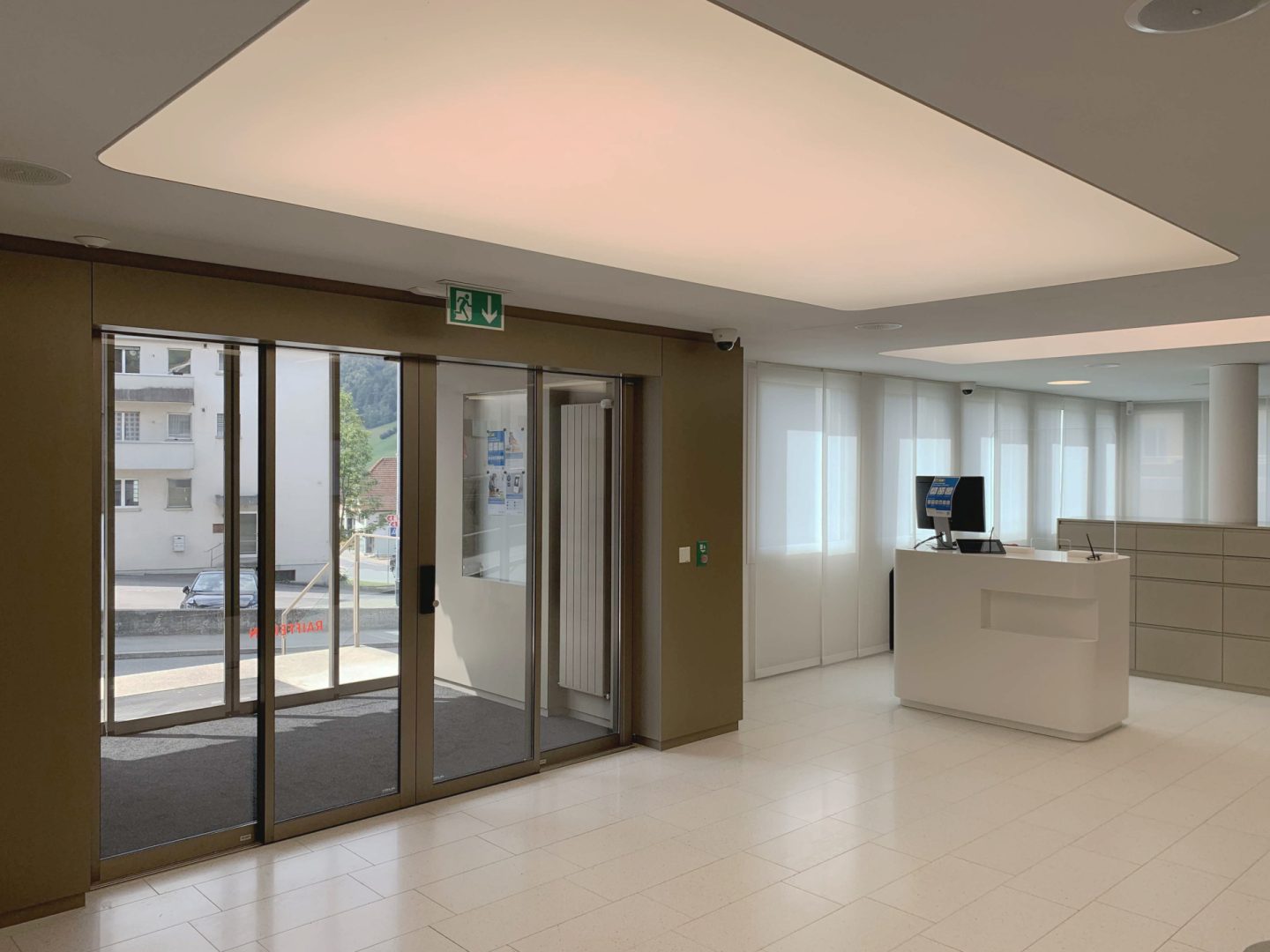 Die Teilnutzung des Gebäudes als Geschäftshaus war schwer lesbar. Das Gebäude vermittelte den Eindruck eines reinen Wohnhauses. Aus den vorgenannten Überlegungen und den geforderten Parametern entwickelte sich folgende Projektidee: Drei Körper markieren, gliedern und definieren das Erdgeschoss neu. An der Südwestecke wird ein eingeschossiger Raumkörper dem bestehenden Volumen «eingeschoben». Dieser soll nicht nur den Bankeingang markieren, sondern auch die Nutzung eines Finanzinstitutes nach Aussen tragen. Im Innern, entlang der östlichen Längsfassade, wird die bestehende Raumschicht mit Treppen, Tresorraum etc. verdichtet. Das restliche Erdgeschoss wird freigespielt. Zwei schlanke, unterschiedlich hohe Kuben (Raumkörper 2 und 3) gliedern den freigewordenen Grossraum. Diese bilden zusammen mit dem Eingangskubus (Raumkörper 1) als Dreiklang die eigentliche Entwurfsidee.