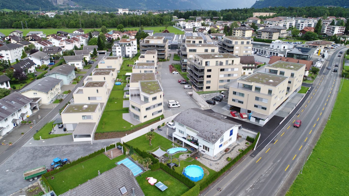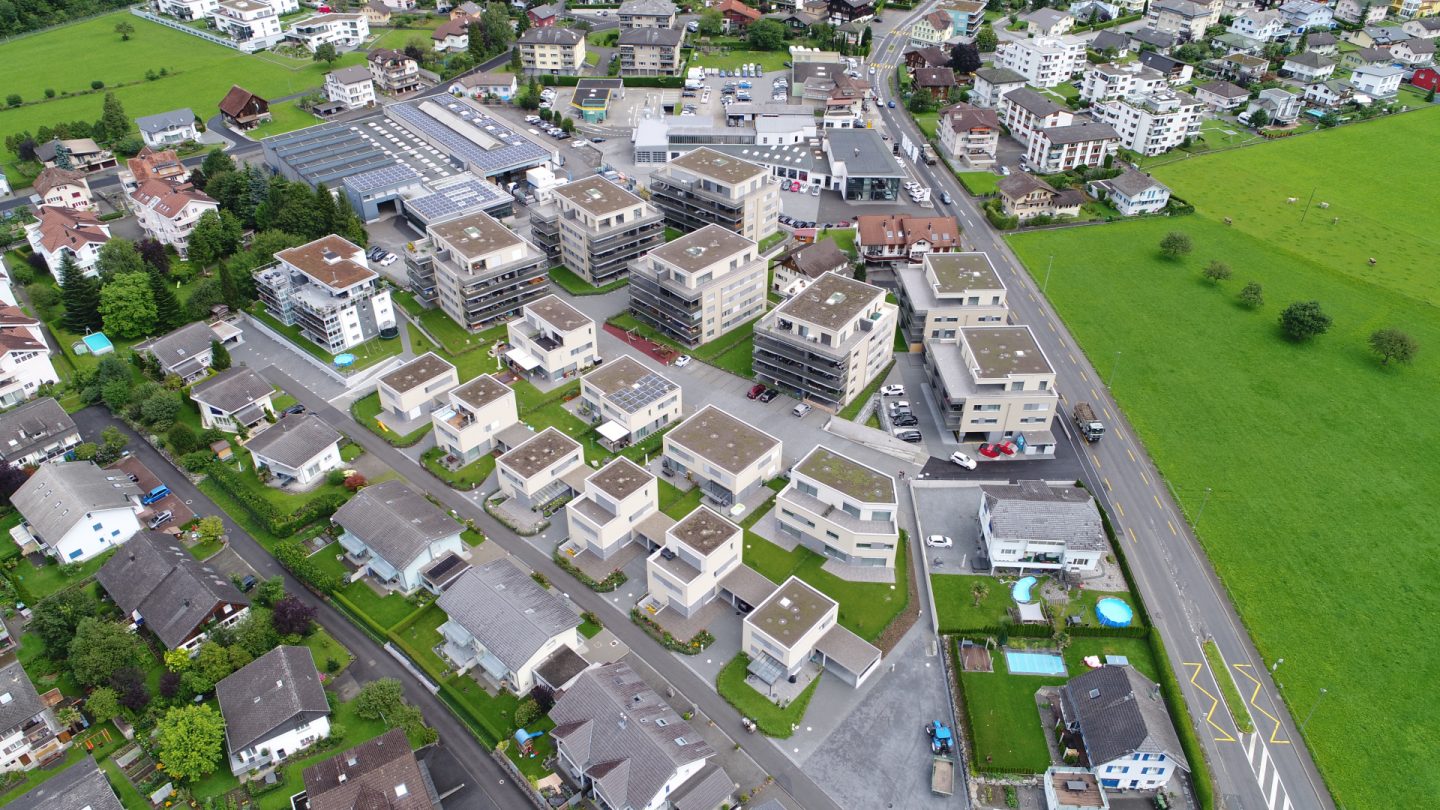 Die Überbauung, bestehend aus 7 Einfamilienhäusern, 4 Doppeleinfamilienhäusern sowie 5 Mehrfamilienhäusern mit insgesamt 66 Eigentums- und Mietwohnungen (2.5 Zi – 5.5 Zi.), umfasst insgesamt 97 Wohneinheiten. Die einzelnen Volumen gliedern sich sanft in den bestehenden Kontext ein. Am oberen Ende der Parzelle, wo Industriebauten und die Hauptstrasse angrenzen, stehen die Mehrfamilienhäuser. Gegen die bestehenden Einfamilienhaussiedlungen sind die kleineren Volumen wie Doppel- und Einfamilienhäuser positioniert. Die Mehrfamilienhäuser und Doppeleinfamilienhäuser werden durch eine zentrale Platzgestaltung und eine Tiefgarage mit 114 Einstellplätzen zusammengefasst. Die Tiefgarage sowie die Untergeschosse der Häuser bilden das Fundament der Überbauung. Die Einstellhalle war planungstechnisch der herausforderndste Teil der Überbauung, da 9 Häuser mit unterschiedlichen Höhenniveaus angeschlossen werden mussten. Alle Häuser sind als Massivbau ausgeführt mit verputzter Aussenwärmedämmung.